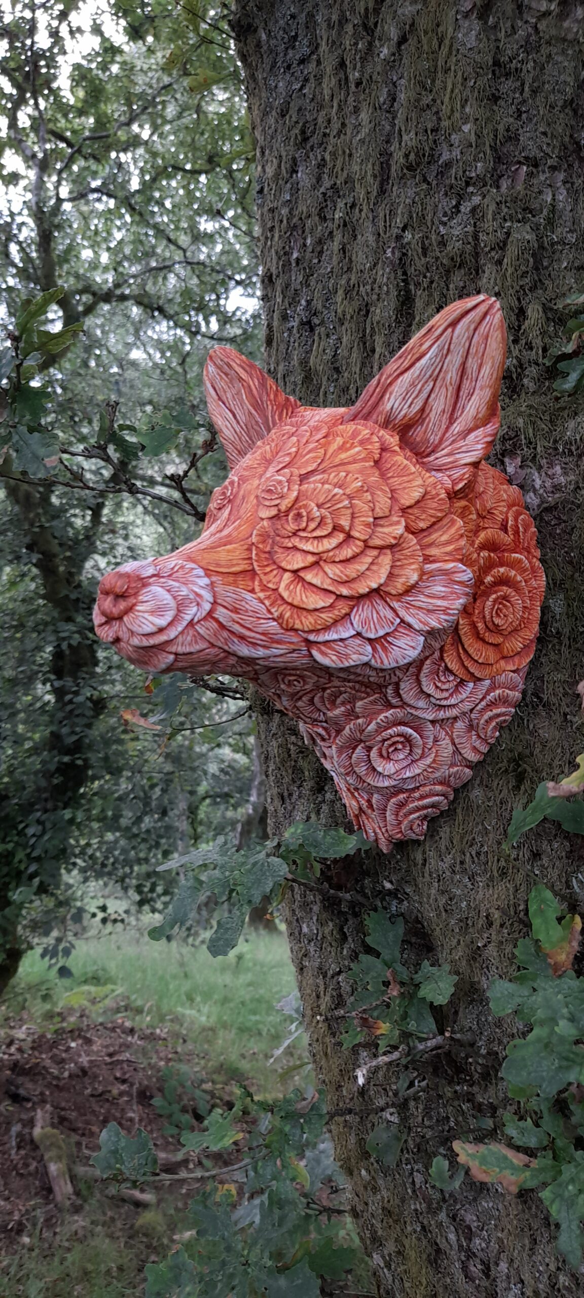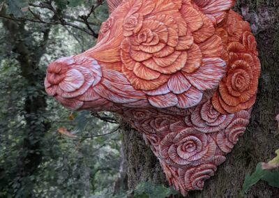 This sculpture is part of a personal investigation into how natural forms can be built from other natural patterns. The fox — a shape I return to often — provided a structure I could trust, allowing me to focus on how floral elements might define form rather than decorate it. The petal-like shapes are arranged with visual rhythm and balance, but not rigid pattern. By drawing the natural colours of a fox across the surface, the piece becomes unified — not many flowers, but one complete shape. Flower Fox is less about what it represents, and more about what can be built when structure and repetition work together.