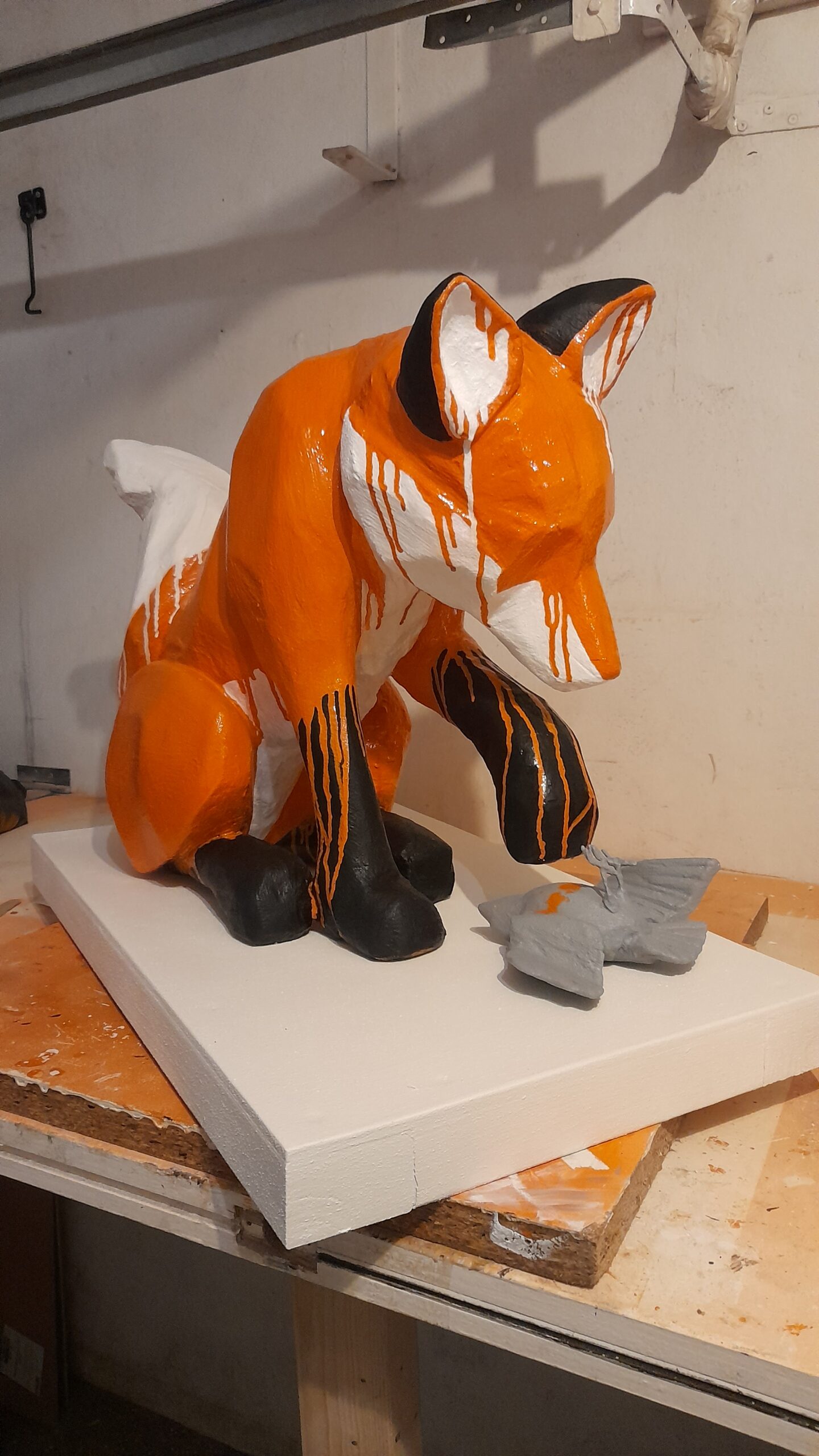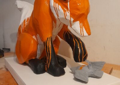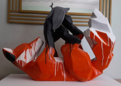 This sculpture explores a moment of quiet curiosity — the kind that sits somewhere between innocence and unease. A simplified fox figure looks down at a bird beneath its paw, not with malice, but with interest. The limited colour palette and soft drips between tones suggest a quiet merging of ideas — life, death, attention, and stillness — all held in one suspended moment.