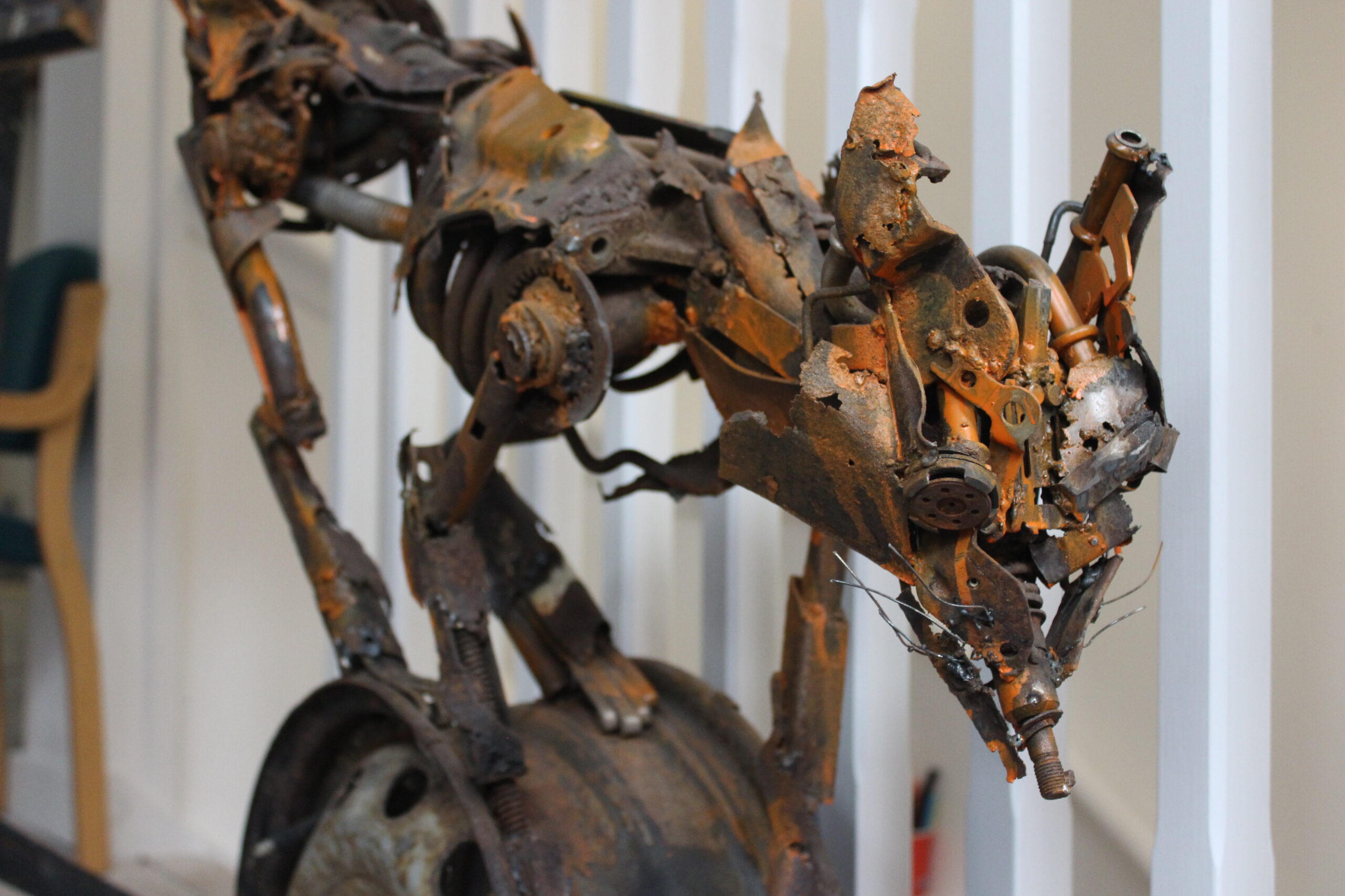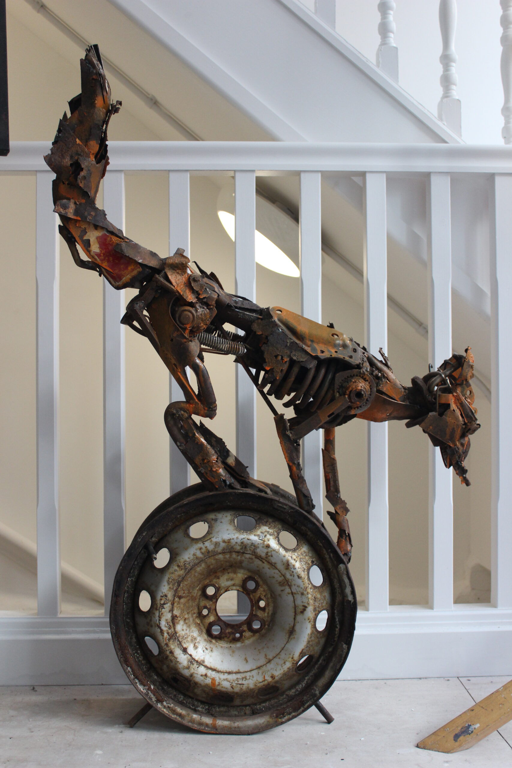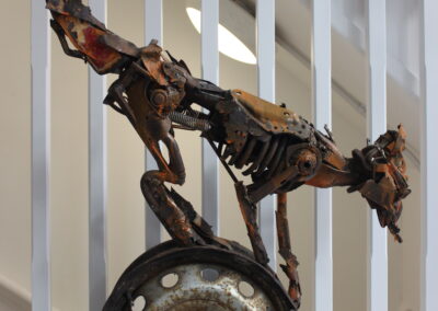 This one-metre-tall sculpture is assembled from rusted scrap car parts, with natural corrosion creating a range of orange, red, brown, and yellow tones reminiscent of a fox’s coat. Its downward gaze and off-centre stance create a tension between stillness and motion.